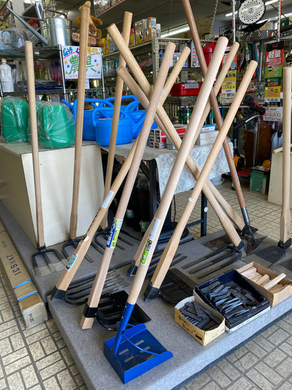 辰野店でも冬から春、夏仕様に模様替えを少し行いまして、店舗入ってすぐの目玉商品のエリアに農具をディスプレイしました!畑仕事に必要なグッズ、くわ、じょうろ、草かき、楔、鎌など、種類豊富なラインナップでご用意しております。その他にもカラス除けのネットや、肥料、軍手、ブロック、害虫スプレーなど畑仕事をする方々に必要なものも多数ご用意ございます。ぜひお気軽に店舗までお越しくださいませ。お電話もお待ちしております。